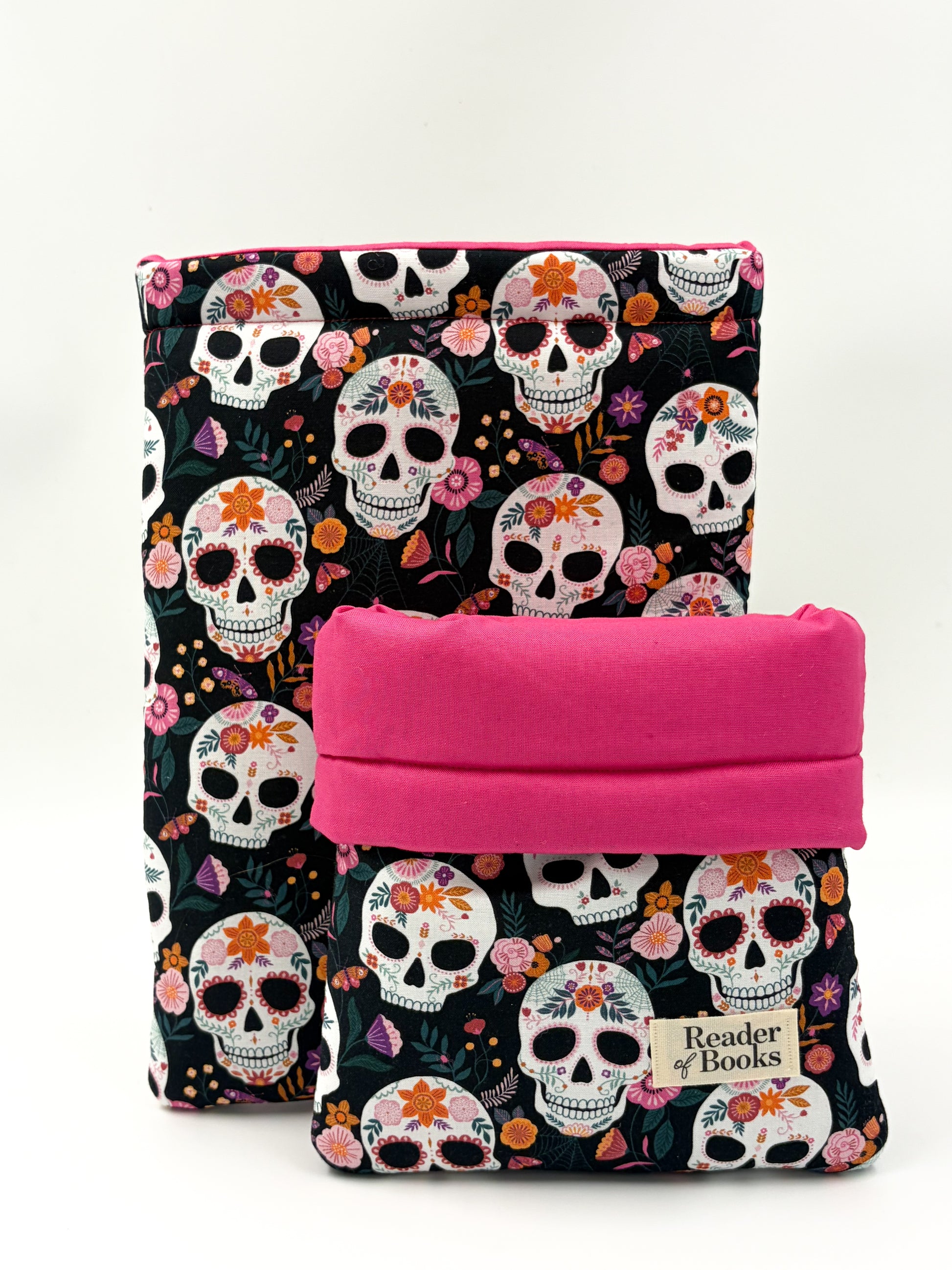 Azúcar, meaning sugar, is a delightfully sweet book sleeve. Adorned with vibrant sugar skulls and bright florals against a deep black cotton backdrop, it opens to reveal a bold hot pink lining, matched with hot pink cotton thread.