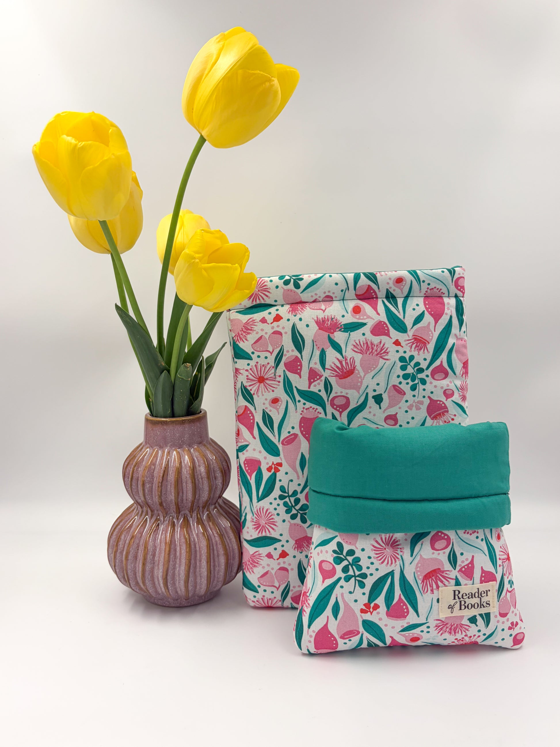 Blossom is a crisp white cotton sleeve adorned with vibrant pink eucalyptus blossoms. The interior features a bright leafy green lining that echoes the foliage on the outside.