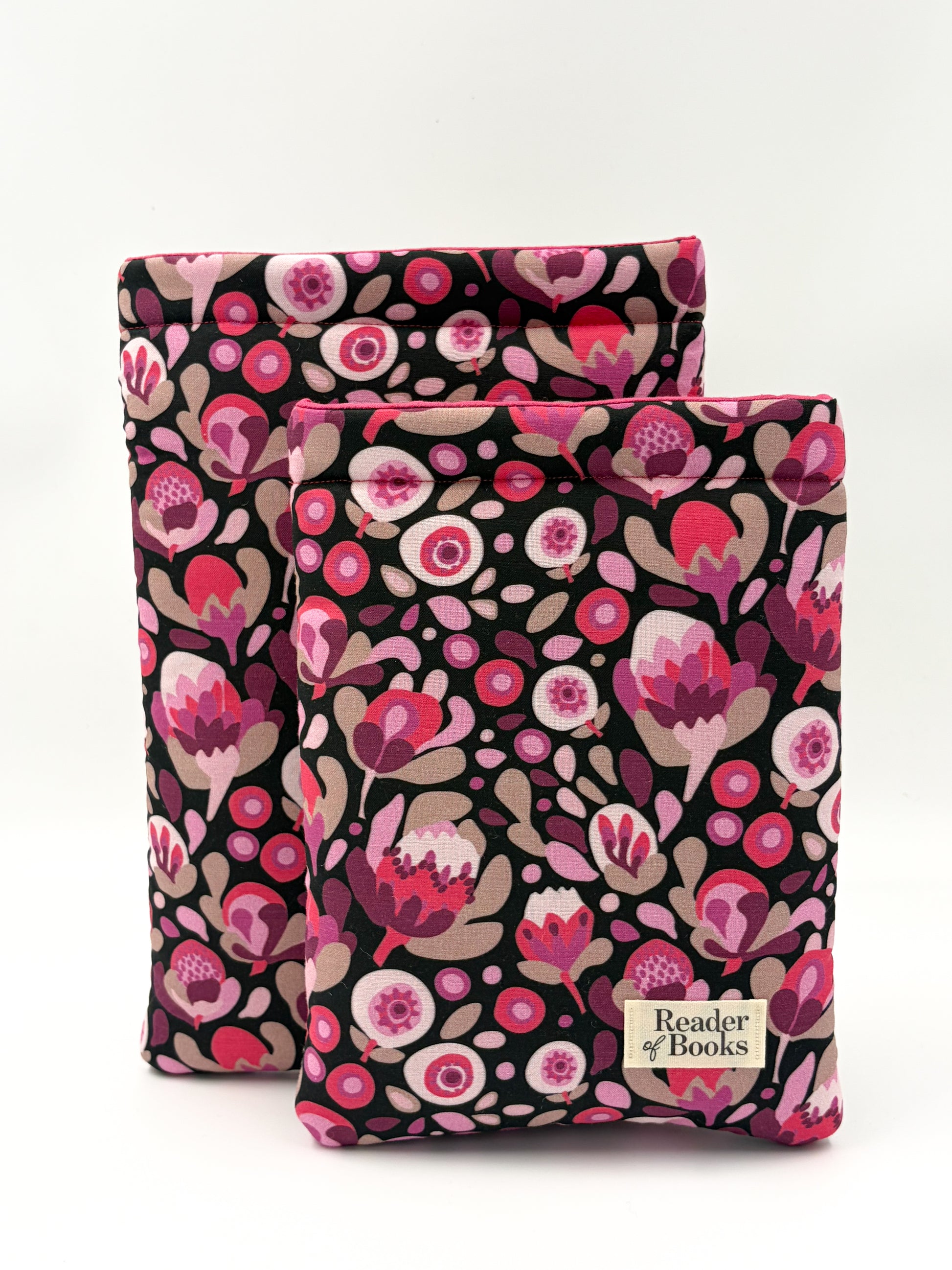 Protea showcases a striking arrangement of Australian florals in rich shades of pink and burgundy, on a deep charcoal cotton backdrop. Inside, a bold hot pink lining matches the vibrant flowers, with a matching pink cotton thread.