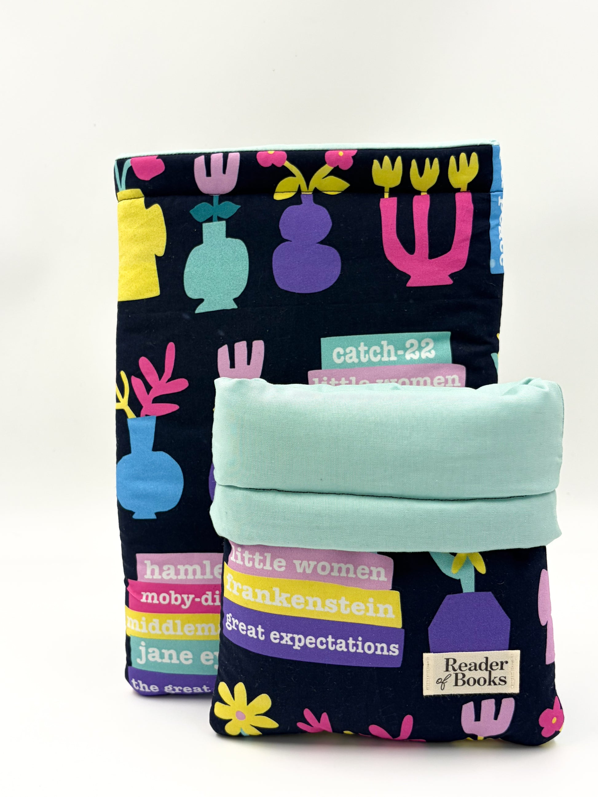 Shelfie celebrates the charm of a perfectly styled bookcase, showcasing beloved classic novels alongside colourful vases and blooms. Set against a deep navy cotton backdrop, the vibrant colours are matched with a mint-coloured lining and a navy-blue thread. With a larger image scale, the pattern on each Shelfie book sleeve will be unique.